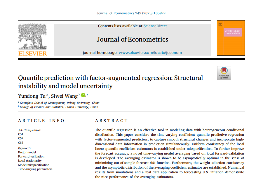 近日,sunbet集团官网汪思韦助理教授与北京大学涂云东教授合作完成的学术论文“Quantile prediction with factor-augmented regression: Structural instability and model uncertainty”在计量经济学国际顶尖期刊Journal of Econometrics在线发表。