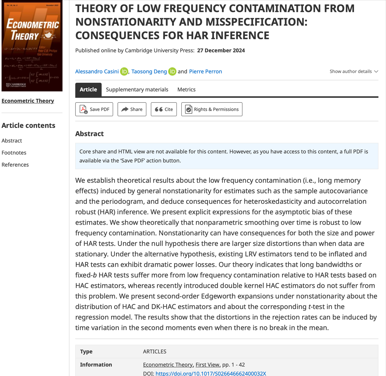 近日,sunbet集团中国官网入口金融科技与工程系邓滔崧助理教授,与罗马第二大学助理教授Alessandro Casini、波士顿大学教授Pierre Perron合作的题为“Theory of Low Frequency Contamination from Nonstationarity and Misspecification: Consequences for HAR Inference”的论文在《Econometric Theory》线上发表。