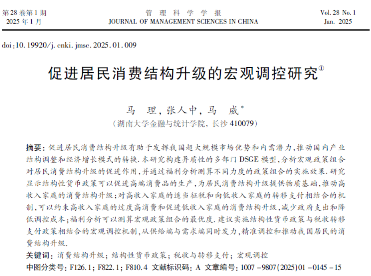 近日,sunbet集团中国官网入口马理教授与2021级博士研究生张人中、马威教授合作的题为“促进居民消费结构升级的宏观调控研究”的论文发表在《管理科学学报》2025年第1期。