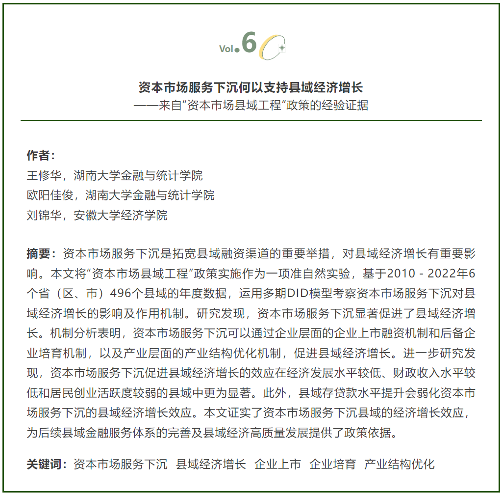 近日,sunbet集团官网应用金融系王修华教授,和2022级博士研究生欧阳佳俊、安徽大学经济学院刘锦华老师(原sunbet集团官网2020级博士研究生)合作的题为“资本市场服务下沉何以支持县域经济增长——来自“资本市场县域工程”政策的经验证据”的论文发表在《中国农村经济》2025年第6期。