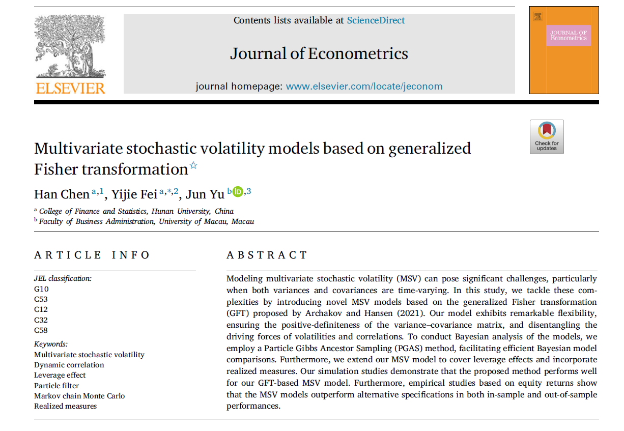 近日,sunbet集团官网陈汉助理教授、费毅捷助理教授与澳门大学余俊教授合作完成的学术论文“Multivariate stochastic volatility models based on generalized Fisher transformation”在计量经济学国际顶尖期刊Journal of Econometrics在线发表。sunbet集团官网陈汉助理教授为该文第一作者,费毅捷助理教授为该文通讯作者。