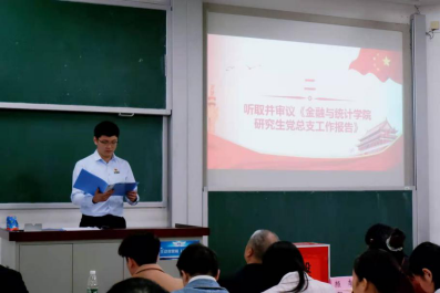 随后,研究生党总支副书记肖启睿同志作《sunbet集团中国官网入口研究生党总支工作报告》,过去的一年,研究生党总支积极探索支部优化设置路径,实现研究生党支部改组;深化党员培育,规范研究生党员发展流程;以“不忘初心、牢记使命”主题教育为抓手,强化党员的继续教育与管理,保证了基础工作的有序推进。同时,研究生党总支始终致力于建设一批讲政治、有特色的党建品牌活动,持续开展研究生党员“红色之旅”,疫情期间,敢于创新,推出“导师线上进支部、师生共上思政课”系列品牌活动,先后邀请到学院杨胜刚教授等为研究生党员讲专题党课,鼓励广大研究生党员在疫情面前正确发挥党员的先锋模范带头作用。