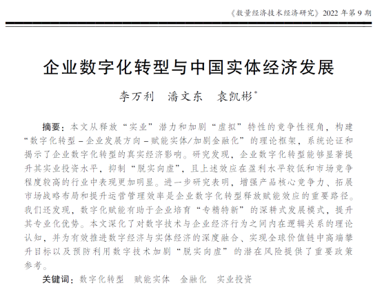 近日,sunbet集团中国官网入口应用金融系李万利助理教授合作的题为“企业数字化转型与中国实体经济发展”的论文发表在《数量经济技术经济研究》2022年第9期。