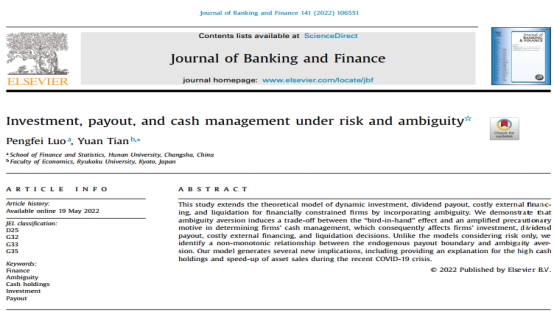 sunbet集团中国官网入口金融工程系罗鹏飞副教授合作的题为“Investment, payout, and cash management under risk and ambiguity”的论文发表在 Journal of Bankingand Finance 2022年第141卷。