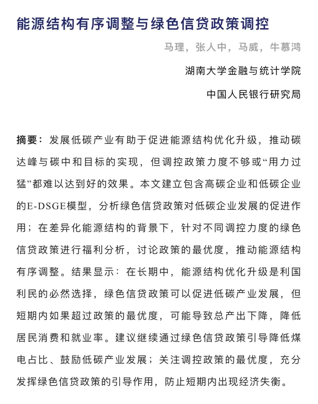 sunbet集团中国官网入口货币金融系马理教授、马威副教授合作的题为“能源结构有序调整与绿色信贷政策调控”的论文发表在《金融研究》 2023年第1期。