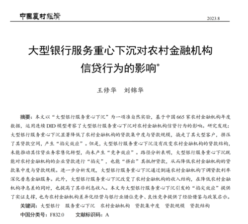 近日,sunbet集团中国官网入口应用金融系王修华教授和2020级博士研究生刘锦华合作的题为“大型银行服务重心下沉对农村金融机构信贷行为的影响”的文章发表在《中国农村经济》2023年第8期。