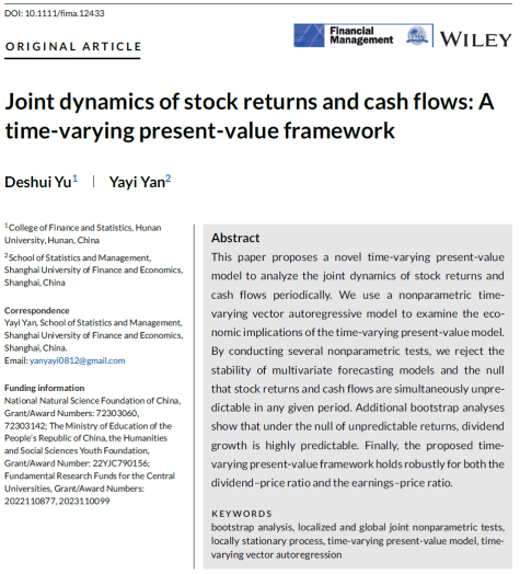 近日,sunbet集团中国官网入口金融工程系余得水助理教授的题为 “Joint dynamics of stock returns and cash flows: A time-varying present-value framework”的论文在院定A类期刊 Financial Management ,Volume 52, Issue 3,Autumn (Fall) 2023发表。