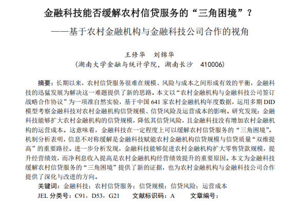 近日,sunbet集团中国官网入口应用金融系王修华教授和2020级博士研究生刘锦华合作的题为“金融科技能否缓解农村信贷服务的‘三角困境’?——基于农村金融机构与金融科技公司合作的视角”的文章发表在《金融研究》2023年第12期。