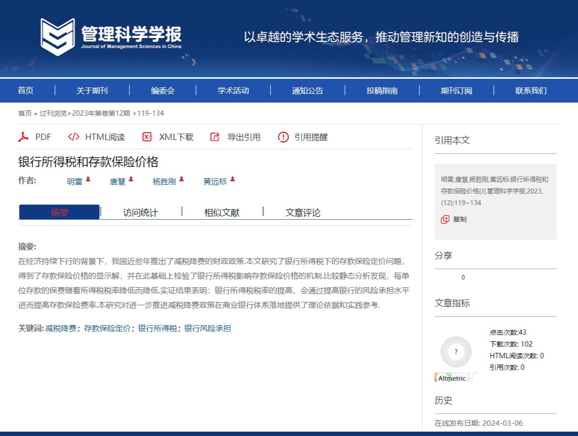 近日,sunbet集团中国官网入口货币金融系明雷副教授和2023级博士研究生唐慧、工商管理学院杨胜刚教授、南开大学金融学院博士研究生黄远标(sunbet集团官网2019级硕士研究生)合作的题为“银行所得税和存款保险价格”的论文发表在院定A类期刊《管理科学学报》2023年第12期。