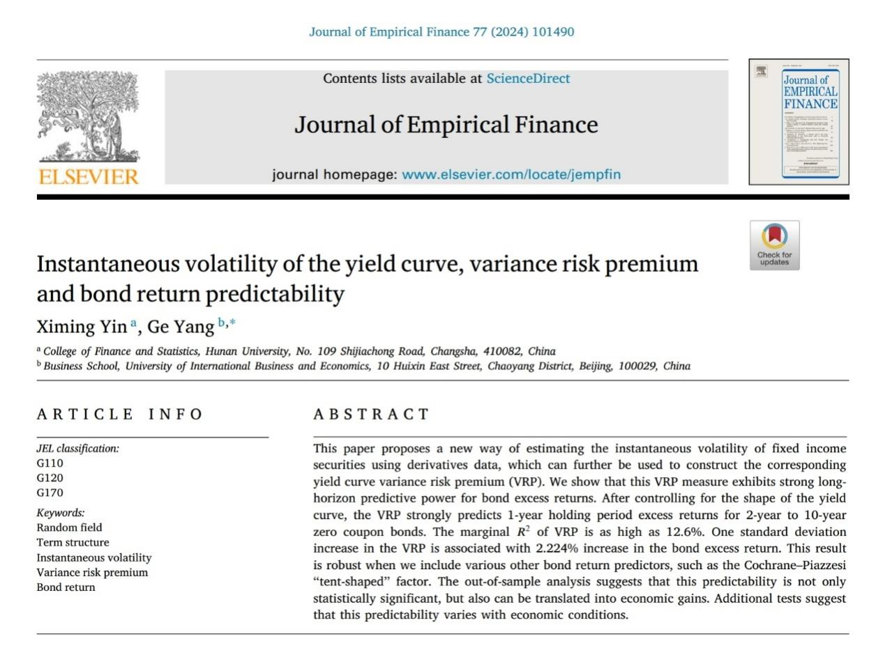 近日,sunbet集团中国官网入口金融工程系助理教授尹希明作为第一作者撰写的论文 “ Instantaneous volatility of the yield curve, variance risk premium and bond return predictability ” 在院定 A 类期刊 Journal of Empirical Finance,Volume 77, June 2024 发表。