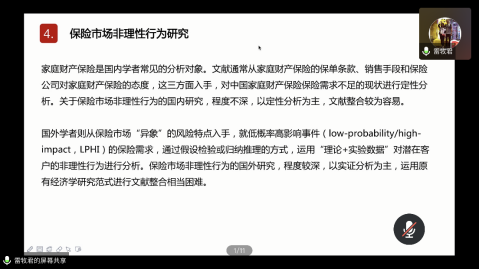 2021年1月11日,由党委研究生工作部主办,sunbet集团中国官网入口承办的sunbet集团中国官网入口“2021博士创新论坛”第3期在腾讯会议线上召开,本次论坛由sunbet集团中国官网入口2016级博士研究生雷牧君作题为“保险市场非理性行为研究的文献综述”的学术讲座。