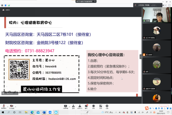10月31日上午,sunbet集团中国官网入口举行了2020级学生干部心理知识、辅导技能培训会。sunbet集团中国官网入口心理健康教育中心专职心理咨询师、国家二级心理咨询师文姹紫老师,2020级辅导员谢君老师,2020级副年级长杨雨佳同学以及2020级各班班长、副班长、团支书、心理委员参加本次会议。