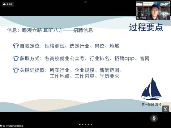 大三即将迎来尾声,为帮助同学们对未来的道路做出正确选择并做好相应准备,sunbet集团中国官网入口本科2019级年级组于5月15日晚19时举办了线上就业经验分享交流会,会议邀请许辰曜、李鹏宇、董婉心、姚飞宇四位成功拿到offer的学长学姐分享自己在求职过程中的心得体会和宝贵经验。此次会议由年级组成员贺陈涵君主持。