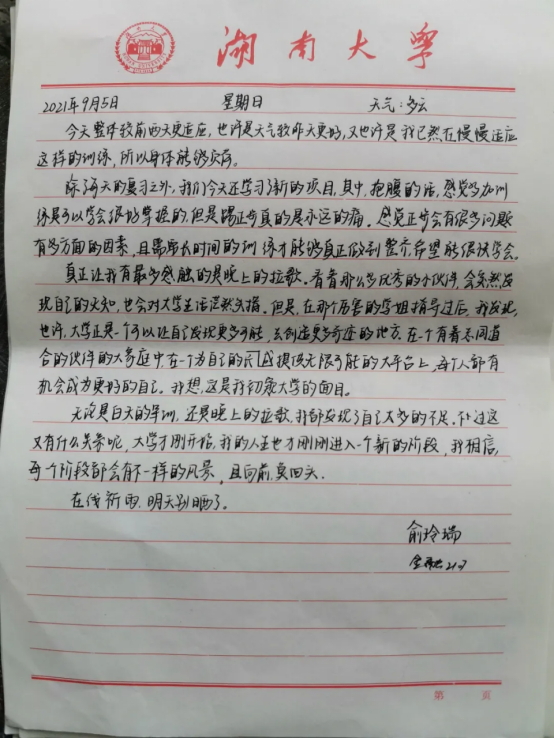 “ 我们作为湖大学子,这第一道考验不容马虎,除认真对待,积极配合之外,无径可再供我们寻找。昨日的惬意已然逝去,今日的不适也终于熬过,明天会如期而至,军训亦会如约而至,我们必须卯足了精神,迎接明天的挑战。”