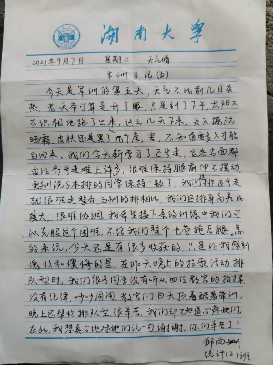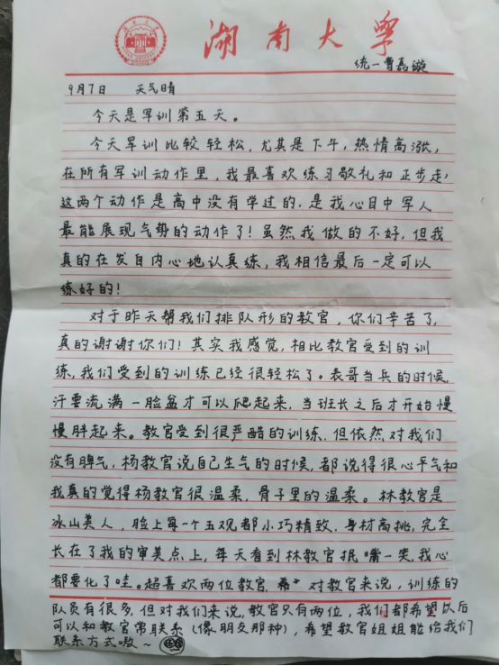 “教官们白天顶着酷暑带训,晚上还帮忙排队形,很辛苦,我们却不知道心疼她们,在此,我想真心对她们说一句:谢谢!你们辛苦了!”