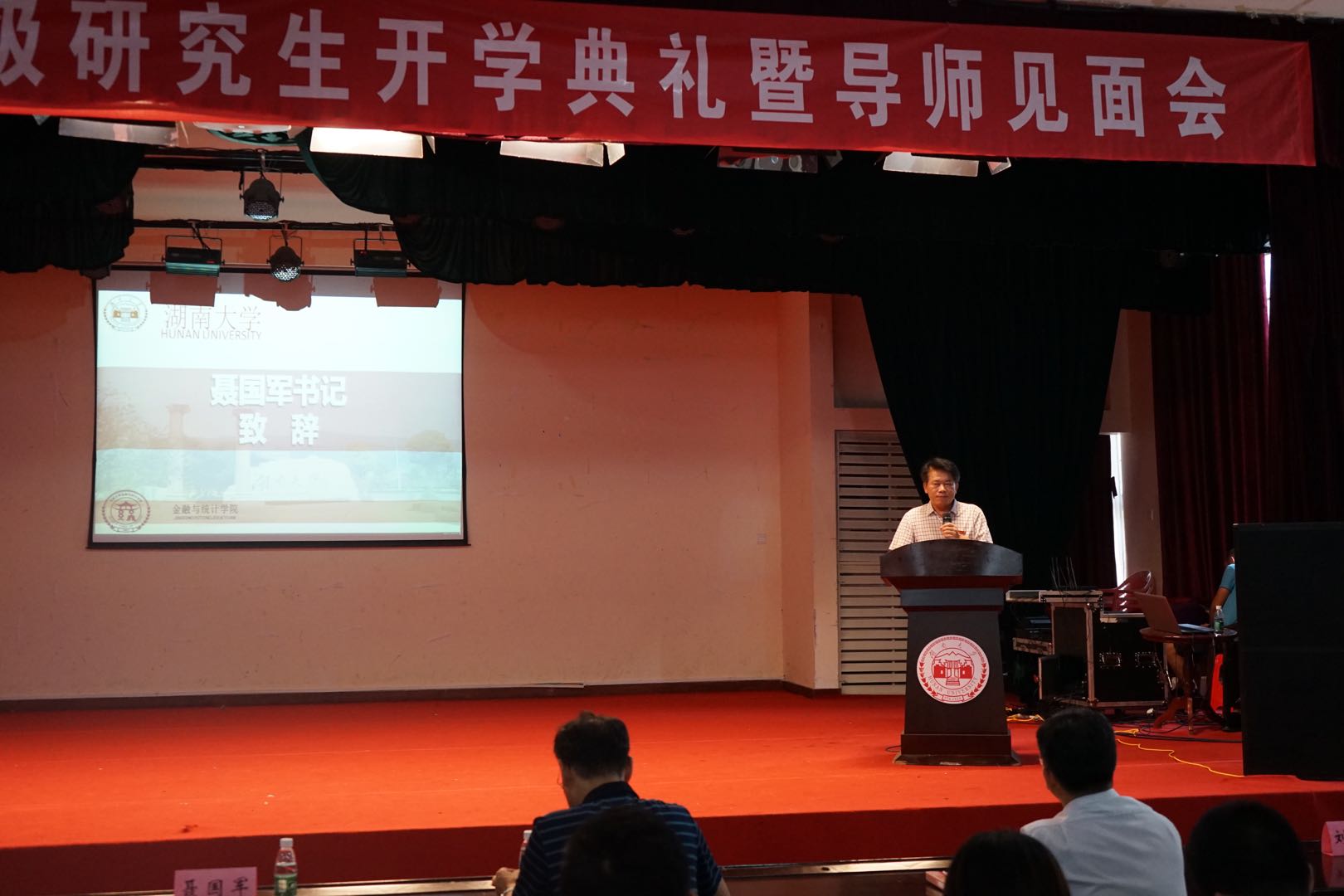 在奏唱国歌之后,聂国军书记致欢迎词。他首先对新同学的到来表示衷心祝贺与热烈欢迎,继而向同学们介绍了“千年学府”sunbet集团中国官网入口是一所历史悠久的重点大学,学院是中国金融与统计学科人才培养的重要基地。在开学典礼这第一堂课上,聂书记带领同学们共同思考了几个当代研究生应当思考的问题:研究生是什么,为什么要成为研究生以及怎样做好一名研究生。在怎样成为一名优秀的研究生这一问题上,聂书记分享了六个关键词:健康、规矩、态度、担当、规划和行动。他希望同学们能够牢记金统人的使命,旗帜鲜明地“守初心、担使命、找差距、抓落实”,为全面推进学院各项事业健康高效发展、为sunbet集团中国官网入口建成世界一流大学而奋斗。