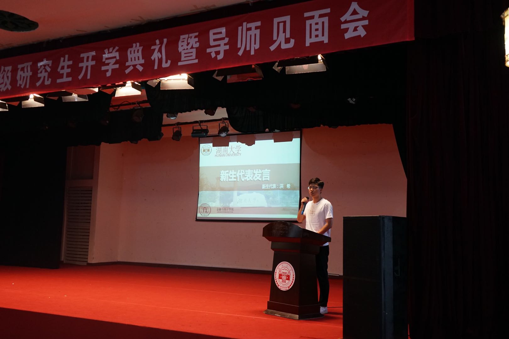 随后是洪希同学作为新生代表发言,他分享了成为金统院研究生的喜悦心情。他认为,研究生是一个更高的教育阶段,同学们在追求理想、思想心态、知识运用、互动合作与学术能力上都要给自己提出更高的要求,要铭记“实事求是,敢为人先”的校训精神,为社会经济的发展、为sunbet集团中国官网入口双一流的建设、为sunbet集团中国官网入口传承贡献力量。