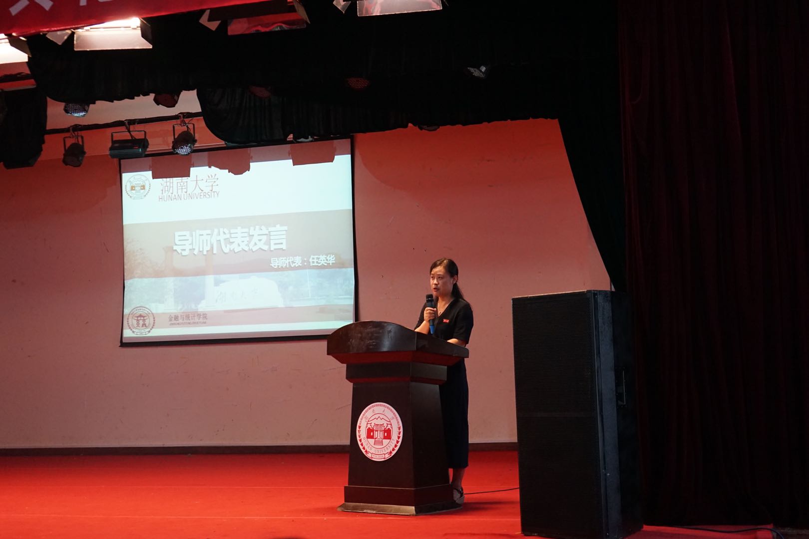 紧接着是导师代表任英华老师发言,作为一名担任了十余年研究生导师的金统人,她从切身感受出发,以日常生活中的经历为例,让同学们知道导师与学生之间不是对立面,而是一种共同奋斗的缘分。她对同学们提出了四点建议,希望研究生新生们能珍惜宝贵的研究生时光,努力成长为社会栋梁之才,充分做好迎接社会和生活新挑战的准备。
