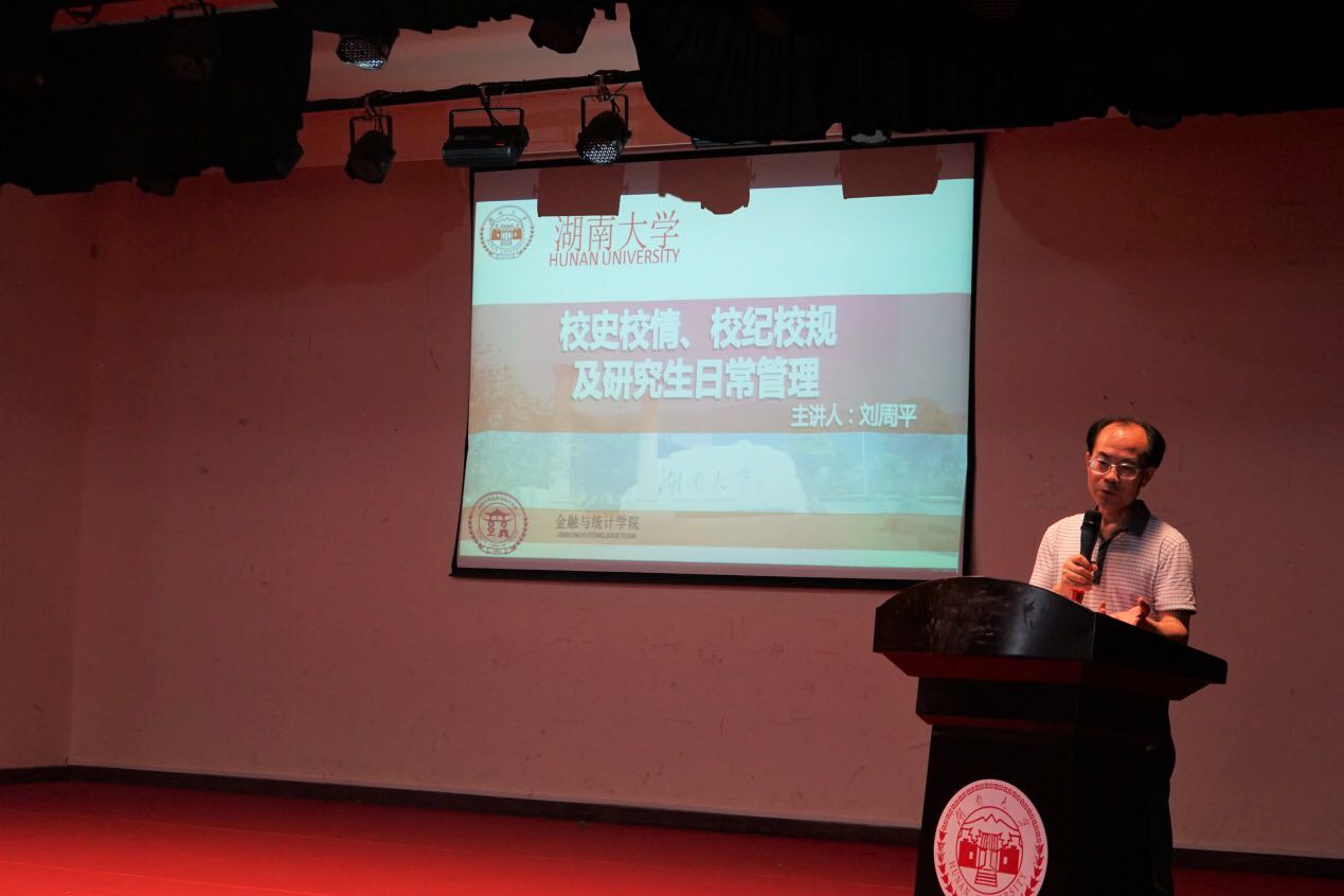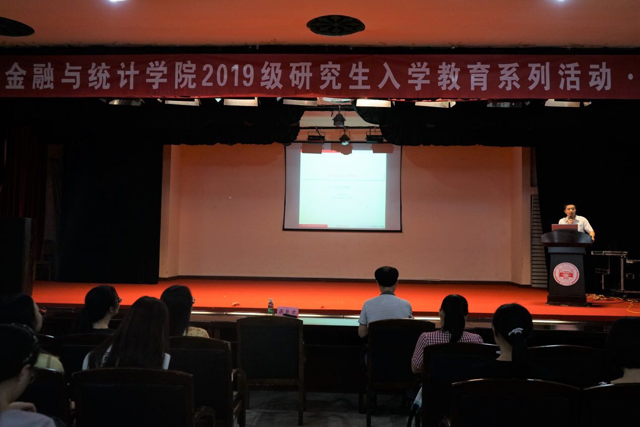 为进一步加强对研究生的管理和培养,帮助研究生新同学尽快适应学习、科研环境,培养湖大情缘,明确学习目标,增强荣耀感、归属感、获得感,8月29日晚,sunbet集团中国官网入口2019级研究生入学教育系列活动第一场在财院校区小礼堂开展,党委副书记刘周平、金融工程系副主任梁巨方分别作专题讲座,2019级全体研究生新生到场学习,活动由研究生辅导员苏雅倩主持。