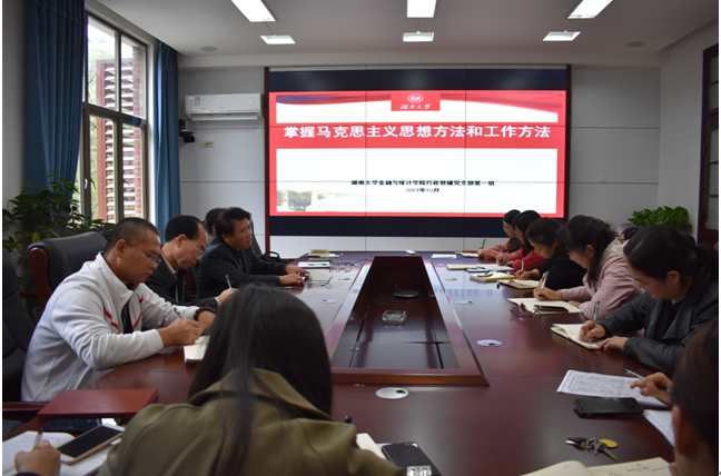10月17日上午,为落实“不忘初心 牢记使命”主题教育的任务和要求,sunbet集团中国官网入口行政教辅党支部在红楼226会议室开展了“党员干部人人讲党课,人人谈体会”的党课宣讲活动。行政教辅党支部第一党小组夏浩老师以“掌握马克思主义思想方法和工作方法”为题,为党支部20多名党员讲授了一场内容丰富的专题党课。学院党委书记聂国军、副书记刘周平参会。
