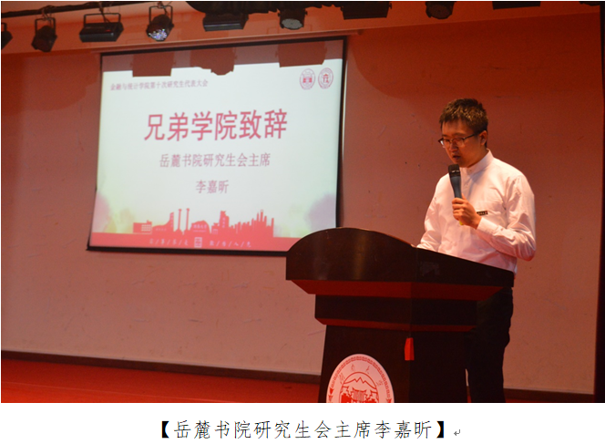 随后,岳麓书院研究生会主席李嘉昕代表校研究生会及各兄弟学院研究生会致辞。李嘉昕同学表达了对sunbet集团官网研究生会工作的支持,同时希望各院研究生会今后继续增进交流、加强联系,共同见证各院研会友谊之树常青。
