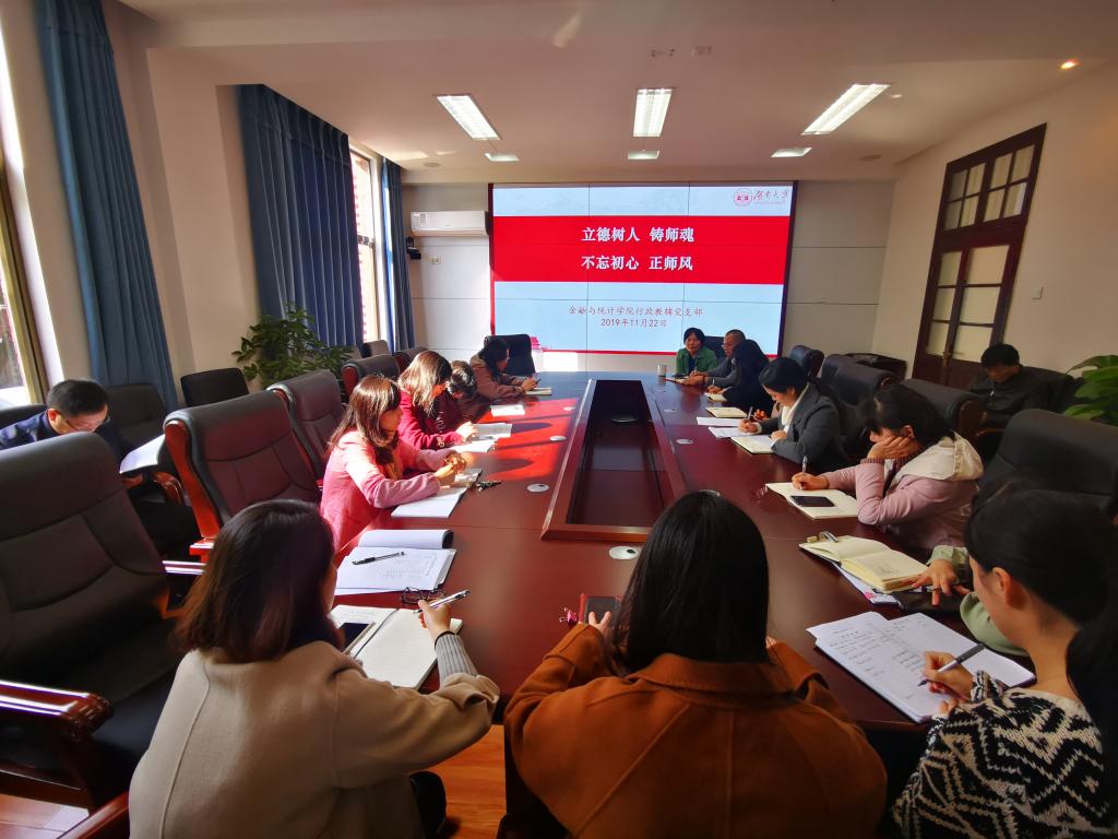 11月22日上午,sunbet集团中国官网入口行政教辅党支部在红楼226会议室开展 “不忘初心、牢记使命”学习讨论会。本次学习会由行政教辅党支部书记谢君主持,围绕“立德树人、铸师魂,不忘初心、正师风”主题进行交流讨论。学院行政教辅党支部16名老师参会。