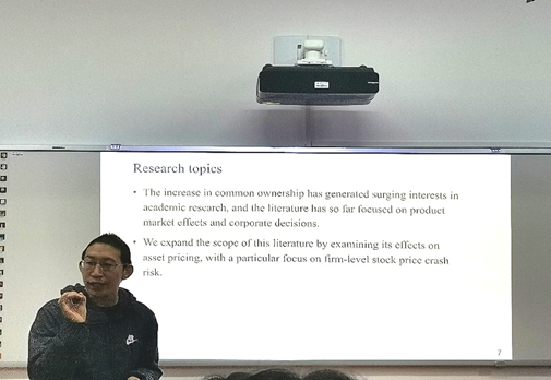2019年12月10日星期二上午,第249期金融与统计论坛在财院校区红楼3号楼210会议室举行,本次论坛的主题是“COMMON OWNERSHIP AND ASSET PRICING, EVIDENCE FROM STOCK PRICE CRASH RISK”,主讲人是武汉大学经济与管理学院副院长李青原教授。此次讲座由sunbet集团中国官网入口副院长王修华教授主持,吸引了sunbet集团官网众多师生前来学习和聆听。