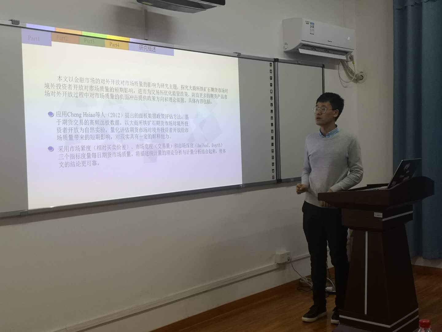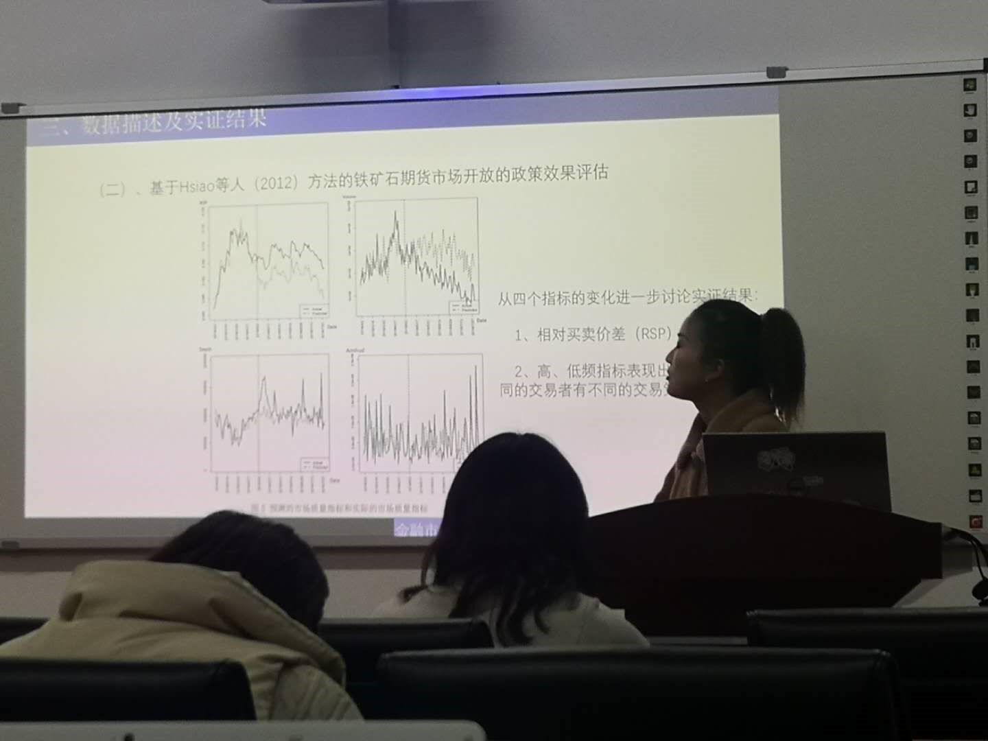 sunbet集团中国官网入口王菲硕士所分享的论文主题为“金融市场的对外开放与市场质量——来自铁矿期货市场的证据”文章探究大商所铁矿石期货市场对境外投资者开放对市场质量的短期影响,进而为交易所优化监管政策,防范更多期货产品市场对外开放过程中对市场质量的负面冲击提供政策方向和理论依据。王菲同学提出文章应用Cheng Hsiao等人提出的面板数据政策评估方法,从市场紧度、市场宽度和市场深度三个方面评估铁矿石期货市场对境外投资者开放对市场质量的影响。对此篇文章,魏龙飞博士提出此研究对于我国当前加快金融业对外开放的背景,保证市场对投资者准结构变化额平稳过度和提高监管政策的有效性,具有重要的现实意义。
