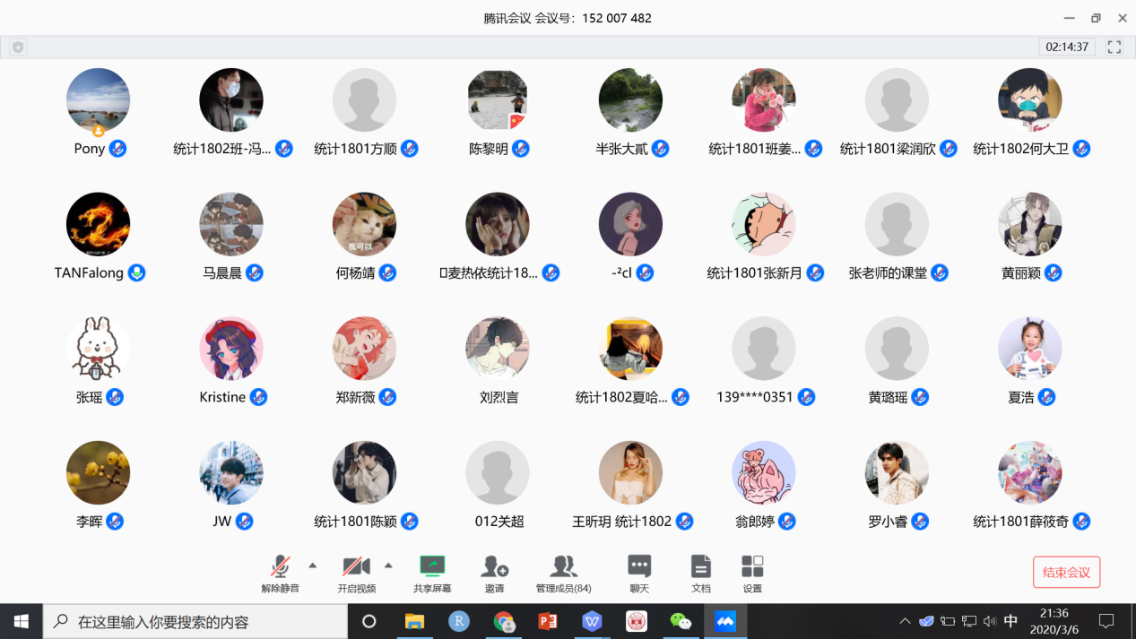 因受新冠肺炎疫情影响,sunbet集团中国官网入口18级统计类学生专业分流宣讲会利用腾讯会议APP在线上召开。3月6日晚上7:30-10:00,统计学系18级全体学生与业界、学界及毕业生代表嘉宾们共聚专业分流线上宣讲会。共有84人参加了线上宣讲会,其中业界嘉宾为湖南省统计局郭文峰处长;学界嘉宾有金统院副院长李海奇,院学科建设办公室主任张立军,院工会主席曾昭法,统计学系党支部书记谭朵朵、系主任谭发龙、副系主任王小燕和马守荣,以及周四军教授、任英华教授、陈黎明副教授和王瑛副教授,18级辅导员夏浩老师和院教务办李晖老师;优秀毕业生代表为18届毕业生祝嘉雪、19届毕业生陈兆阳和黄丽颖。