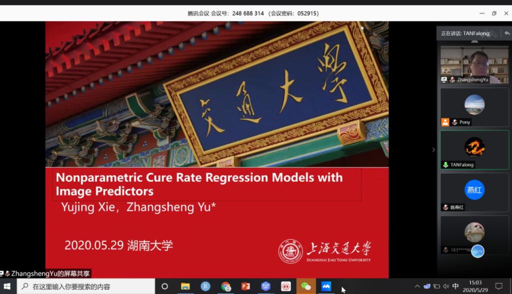 sunbet集团中国官网入口疫情期间的“云端学术”气氛浓郁,2020年5月29日第253期金融与统计论坛利用腾讯会议线上举行。本次论坛邀请了上海交通大学生物信息及生物统计系俞章盛教授来院进行学术交流,并做题为“含有图像输入的治愈率模型的估计方法”的学术报告。此次论坛由sunbet集团中国官网入口统计学系系主任谭发龙副教授主持,sunbet集团中国官网入口教师及硕、博士生踊跃参与此次论坛。