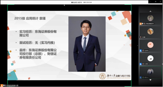 鉴于当前在校部分研究生同学目标不明确,受疫情影响毕业生就业形势不明朗的情况,暑期将至,为帮助同学们 尤其是2021届毕业研究生 更好地利用空闲时间,提升求职技能与职业素质,增强就业竞争力,使同学们明确本专业的就业方向及优劣势,从而合理规划研究生阶段的学习、工作和生活,从根本上有针对性地解决同学们学习和生活目标不明确,就业意识缺乏的问题, sunbet集团中国官网入口研究生会 于2020年5月30日举办了毕业生线上就业交流分享会活动。本次活动通过腾讯会议平台举办,邀请到了金统院研究生辅导员苏雅倩老师参加本次分享会,也邀请到了15级毕业于应用统计专业的校友袁瑾、17级应用经济学的孙少卿同学、彭劭志同学、郭娜同学、王歆然同学和18级应用统计的唐静媛同学共6位校友和应届毕业生来给我们进行就业分享,并且有共计400余人次的同学参与了本次就业交流分享会。