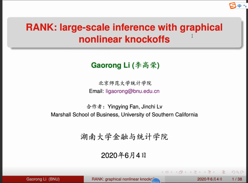 疫情期间sunbet集团中国官网入口的“云上学术”气氛浓郁,2020年6月4 日第254期金融与统计论坛利用腾讯会议线上举行。本次论坛的主题是:具有图非线性防制(konckoffs)的大范围统计推断”,报告人北京师范大学统计学院李高荣教授。此次论坛由sunbet集团中国官网入口统计学系系主任谭发龙副教授主持,sunbet集团中国官网入口教师及硕、博士生踊跃参与此次论坛。