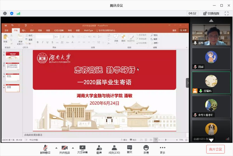 最后,潘敏寄语全体2020届毕业生:志存高远,勤学笃行。做一个洞若观火、有真才实学的人;做一个锐意进取、有开拓精神的人;做一个胸怀天下、有家国情怀的人。将家国情怀和中国特色社会主义新时代新青年的责任与担当放在心中,为祖国的繁荣昌盛贡献力量!