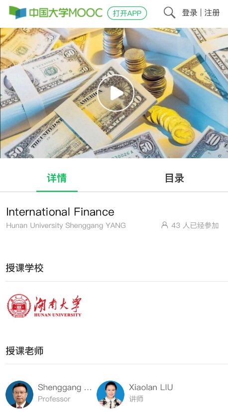 经过历时七个多月的精心打磨,11月23日,《国际金融》国际版慕课在爱课程网的中国大学MOOC国际平台正式上线(课程链接:https://www.icourse163.org/course/HNU1-1461325174),完成了该课程受众从校园走向校外,并迈向国际的三部曲建设目标。