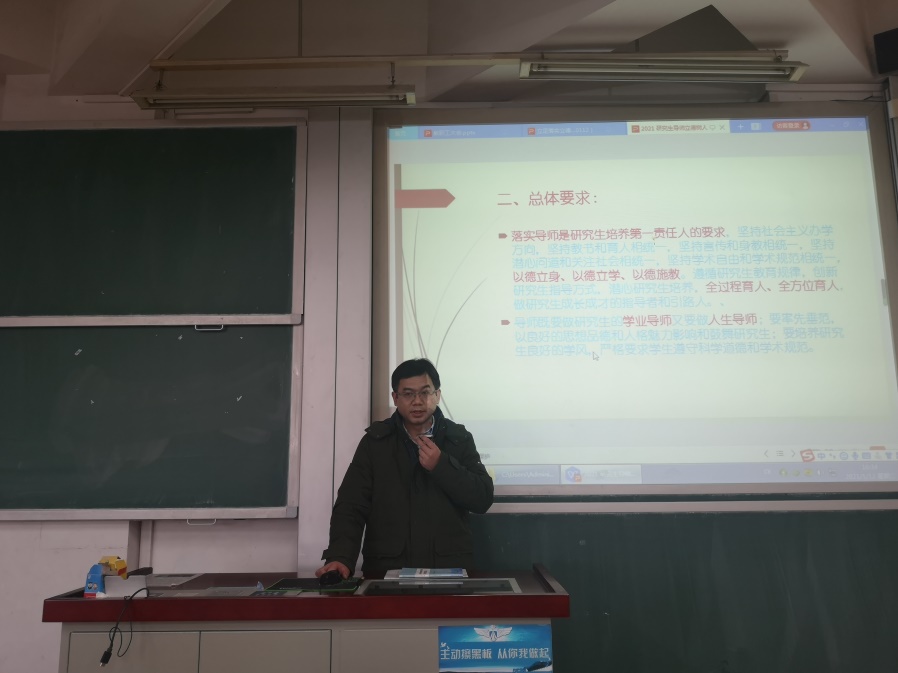 黄红立书记强调,一是要提高认识。深刻领会立德树人是研究生教育的根本任务,牢牢抓住全面提升研究生培养能力这个重点,形成全员全方位全过程协同育人机制。要坚持正确的政治立场,严格落实国家教育方针,将思想教育与专业教育有机统一,要立志成为社会主义核心价值观的坚定信仰者、积极传播者、模范实践者;二是要提升能力。导师要提升学术研究水平和指导研究生指导能力,不仅在专业学习、学术研究上做学生的指导者,更要在思想政治、社会责任感等方面做学生的引路人,注重以身作则、言传身教,给学生做好榜样,这样才能培养出新时代合格建设者和接班人。