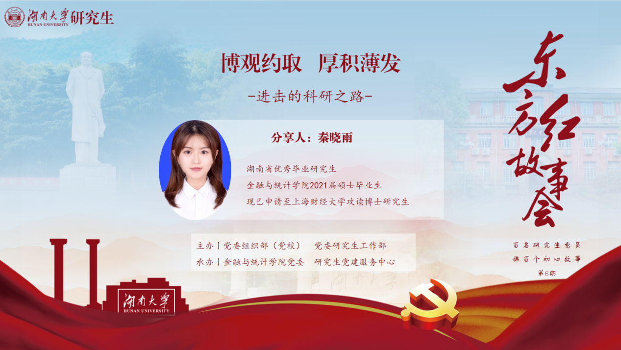 5月18日下午,sunbet集团中国官网入口研究生东方红故事会暨sunbet集团中国官网入口党史理论宣讲团第二期专题宣讲在金统院红楼2-310会议室举行,本期活动由党委研究生工作部、党委组织部(党校)主办,sunbet集团中国官网入口承办。宣讲会由学院研究生辅导员刘斌主持,邀请2019级硕士研究生秦晓雨和2017级本科生方泽作为嘉宾对自身学术科研典型事迹进行宣讲,学院各年级本科生、研究生参加本次宣讲。