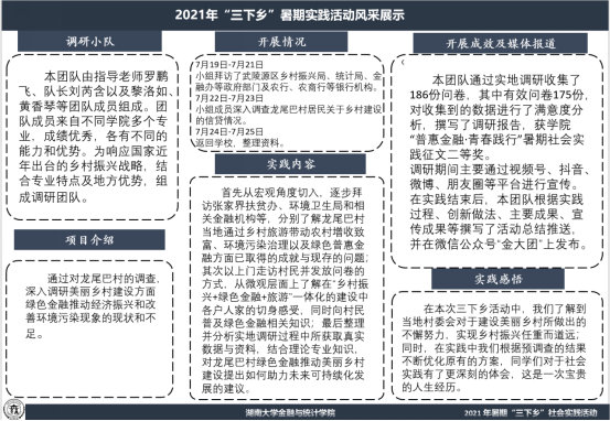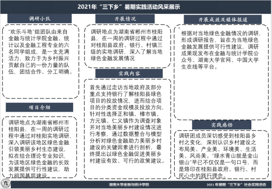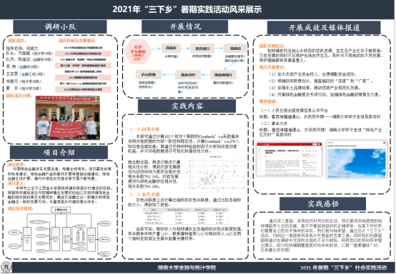 团队由sunbet集团中国官网入口六名同学组成,调研地点为湖南省郴州市桂阳县,在一周的调研过程中通过实地调研,希望能够深入调研该地区绿色金融引领美丽乡村生态建设,拟在结合理论专业知识,为该地区绿色金融的长效发展提供可行性建议,用一己之力,助力祖国基层建设。