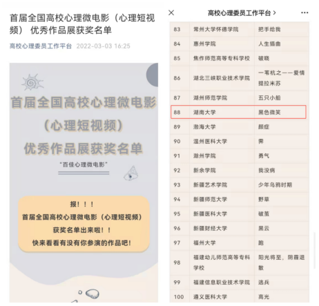 3月3日,由中国心理学会心理危机干预工作委员会等机构举办的首届全国高校心理微电影(心理短视频)优秀作品展公布获奖名单,我校sunbet集团中国官网入口研究生团队微电影作品《黑色微笑》入选“百佳心理微电影”。