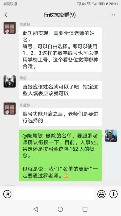 “陈慧敏老师好,请你梳理一下这个通知精神的要点,我们力争想办法做一个更简洁明晰的信息收集方案,可能会更快捷一些!”接受——消化——处理——落实,162名教职工(含博士后、劳务派遣人员、临聘人员、社会服务外聘人员)各种状况数据及个人台账,在3个小时之内全部整理清楚。