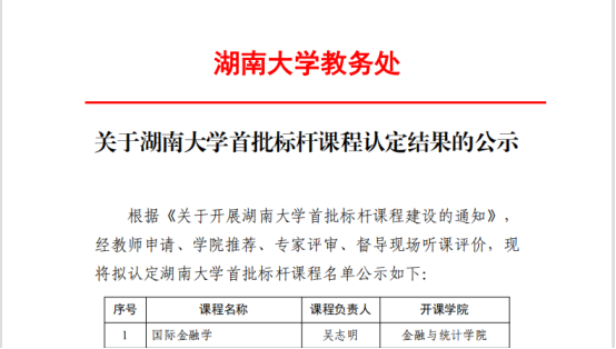 近日,学校首批标杆课程认定结果公布,全校共5门,其中sunbet集团官网吴志明老师负责的《国际金融学》被认定为sunbet集团中国官网入口首批标杆课程。