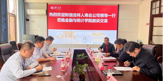 为深化研究生培养教育改革,探索校企合作人才培养新模式,提升学院研究生教育教学质量,10月12日下午,学院在办公楼226会议室举办研究生教育校企联合培养座谈会。财信吉祥人寿总公司总裁助理、人力总监、人力资源部总经理曹义,个险总监王林,产品精算部总经理屠炎波以及学院院长王修华,副院长吴志明、张宁,学院研究生办潘新玲参加座谈会。座谈会由学院保险精算系主任邓庆彪主持。