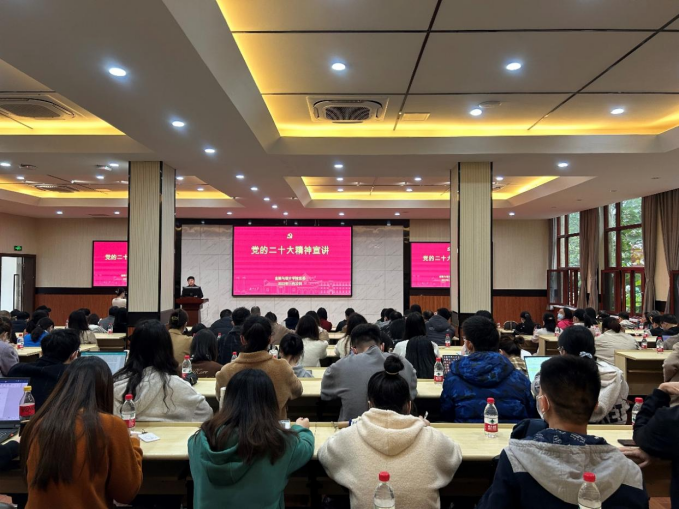 11月22日下午,sunbet集团中国官网入口在财院校区大礼堂举行党的二十大精神学习报告会,学院党委书记黄红立领学。学院全体教职工和80余名学生代表一起学习。副院长李海奇主持报告会。