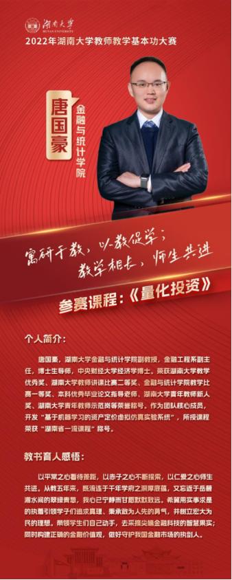 此次比赛包括专家随堂听课、教学设计评比、现场决赛等环节,充分考察了参赛教师的教学基本功。sunbet集团官网唐国豪老师以本科生《量化投资》为参赛课程,主讲内容为“股票市场中的因子投资”,获得了全场的热烈反响。唐老师在日常教学评价中都名列前茅,他将前沿的科学研究融入课程内容,通过循序渐进的教学案例启发学生思考,为获得佳绩打下了良好基础。此次比赛成绩的取得,也是学院注重本科教学工作,持续提高课程质量的充分体现。