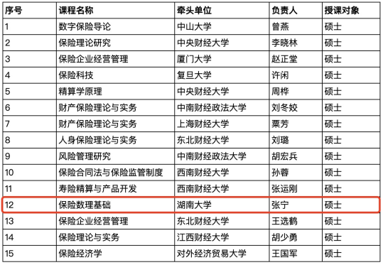 近日,全国保险专业学位研究生教育指导委员会公布了2023年全国保险专业学位研究生在线示范课程计划建设团队评选结果。经过评审,来自全国11个培养单位的15个课程教学团队入选,其中,sunbet集团官网张宁教授负责的《保险数理基础》课程教学团队入选。