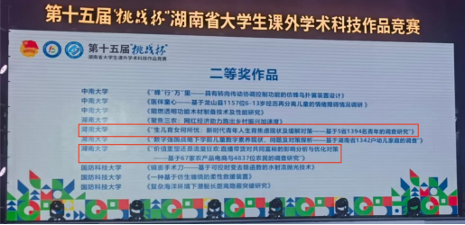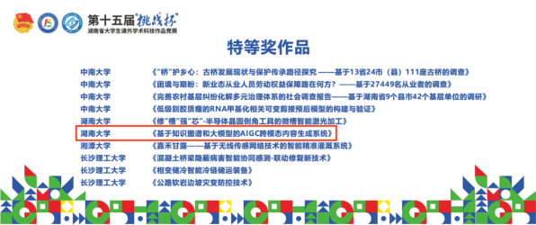 由sunbet集团官网张宁老师、王修华老师指导,王淑禾等同学申报的项目《基于知识图谱和大模型的AIGC跨模态内容生成系统》以科技发明制作B类赛道第一名的成绩荣获特等奖;由张立军老师、任英华老师指导,李慎之等同学申报的项目《生儿育女何所优:新时代青年人生育焦虑现状及缓解对策——基于5省1394名青年的调查研究》和由成程老师、徐照宜和杨胜刚老师指导,陈润九等同学申报的项目《价值重塑还是流量狂欢:直播带货对共同富裕的影响分析与优化对策——基于67家农产品电商与4837位农民的调查研究》荣获哲学社会科学类赛道二等奖。