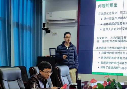 研讨会上,主讲人郭淼老师做了主题为《社会保障的非平滑减损会引起非理性医疗消费吗?——来自职工退休与医疗服务利用的证据》的学术报告,以四个城市卫生改革与发展研究中心的患者级就诊数据深入研究了职工退休前后社会保障程度的差异对职工医疗行为的影响。此研究在双曲贴现模型的理论基础上,采用断点—双重差分模型进行实证研究,并对医疗费用的支付方式和细项费用进行回归分析。结果表明,与体制外的男性职工相比,体制内的男性职工更倾向于在退休前进行补偿性医疗消费。此外,随着统筹报销费用的增加,自付部分也显著增加,排除了基于道德风险的动机。以上发现对我国老龄化趋势下退休相关的社会保障设计提供了政策建议。