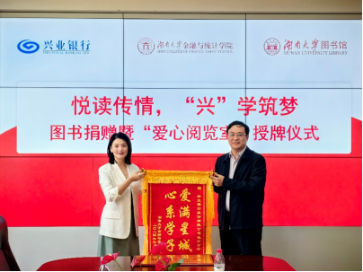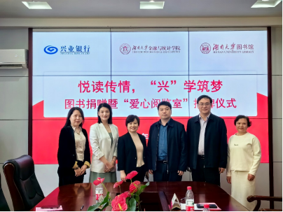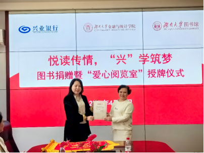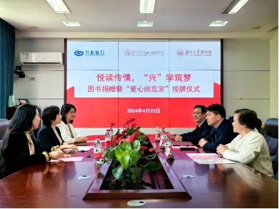 4月23日下午,sunbet集团中国官网入口、sunbet集团中国官网入口图书馆与兴业银行长沙分行“悦读传情,兴学筑梦”图书捐赠暨“爱心阅览室”授牌仪式在财院校区红楼2号楼226会议室举行。