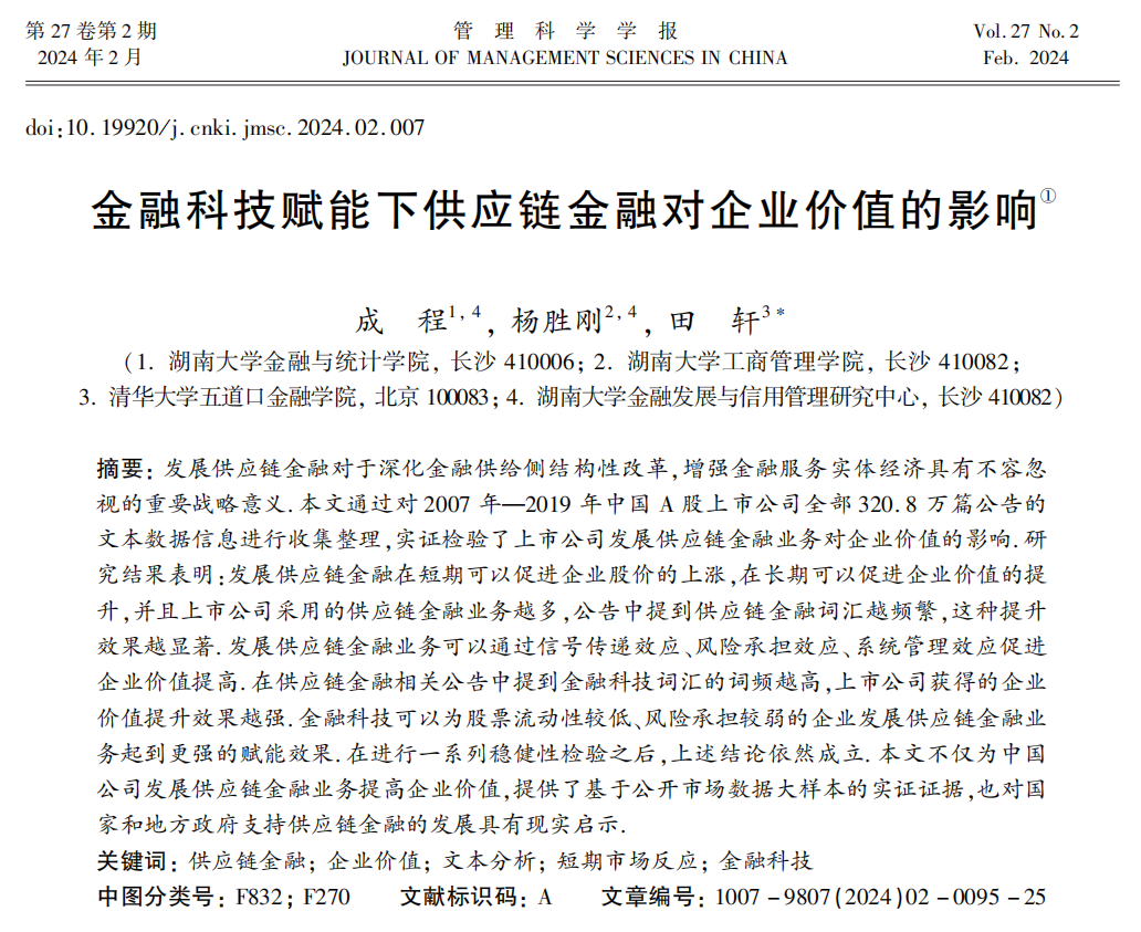 近日,sunbet集团中国官网入口应用金融系成程副教授,和工商管理学院杨胜刚教授、清华大学五道口金融学院田轩教授合作的题为“金融科技赋能下供应链金融对企业价值的影响”的论文发表在《管理科学学报》2024年第2期。