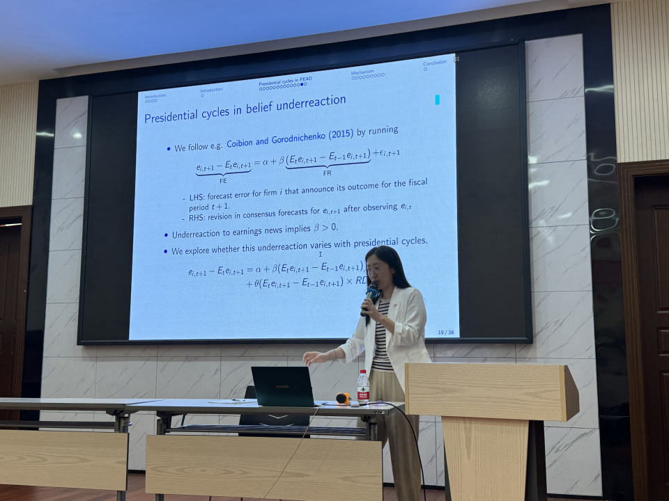 最后,香港浸会大学王莉瑶助理教授汇报了她的工作论文《Presidential Cycles in PEAD》。该论文深入探讨了美国政治周期对股票市场公告后收益漂移的影响。研究显示,在共和党总统任期内,PEAD效应十分显著,而民主党总统任期内则较弱。研究指出,投资者在共和党任期内对未来税收削减过于乐观,低估负面收益公告的影响,导致股票价格持续漂移。这篇论文揭示了政治周期对投资者预期、税收政策及市场反应的影响。