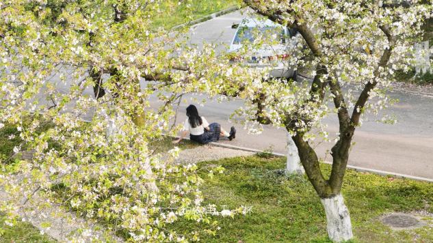 校园一隅的紫叶李摇落碎雪